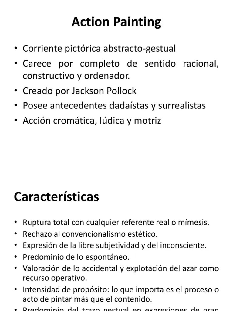 O termo action painting qualifica em simultâneo uma técnica pictórica e uma corrente artística associada ao movimento do expressionismo abstrato, desenvolvido desde os inícios da década de 1940 nos estados unidos da américa e na europa, onde se tornou conhecido por informalismo... La action painting americana tuvo dos tendencias. Una gran energía gestual, total libertad tanto en la concepción de la obra como en la técnica, viendo en el lienzo una proyección de la mente del pintor. Una gran energía gestual, tot. La primera representada por pollock, kline y de kooning, cuyas características principales eran: O gestualismo surgiu na cidade de nova iorque durante os anos 40, suas influências foram diversas, com destaque para os processos de pintura automática utilizados pelos artistas surrealistas.. Una gran energía gestual, total libertad tanto en la concepción de la obra como en la técnica, viendo en el lienzo una proyección de la mente del pintor.