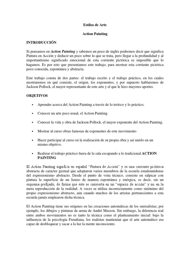 02.06.2003 · el action painting tiene sus orígenes en las creaciones automáticas de los surrealistas;.. . En un primer momento hablamos de un movimiento con una gran energía, representada en obras de jackson pollock o de kooning.